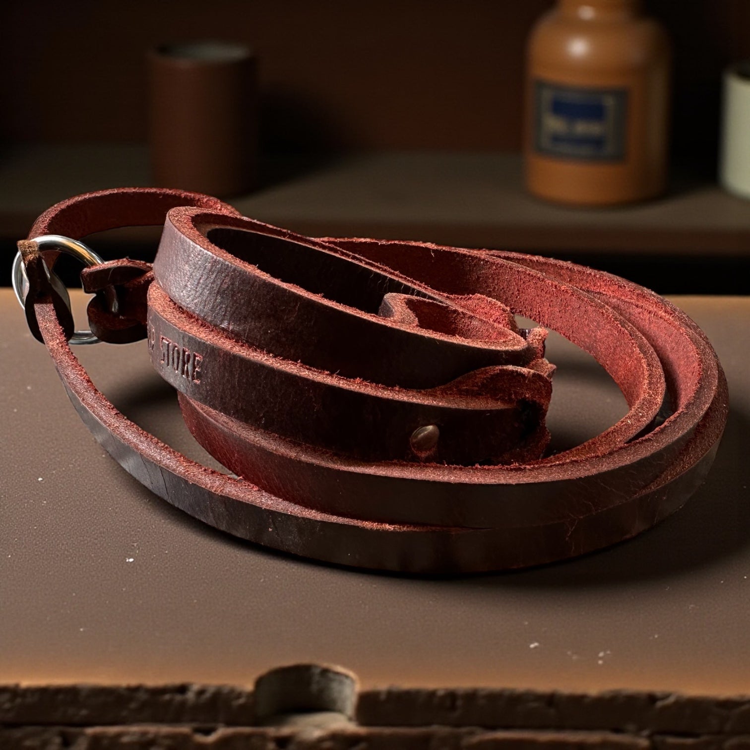 A solid metal ring ensures smooth movement, while the leather adjuster keeps the fit stable. The leash stays light in hand and strong under pressure. Leather softens with use while maintaining structure.